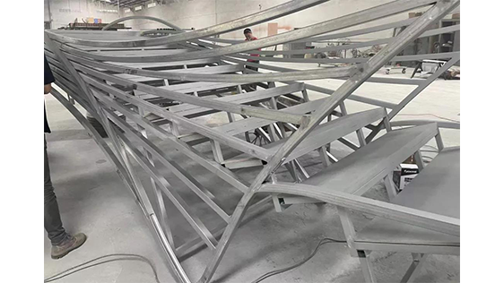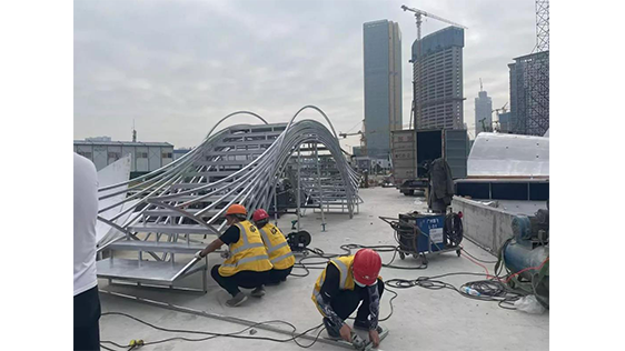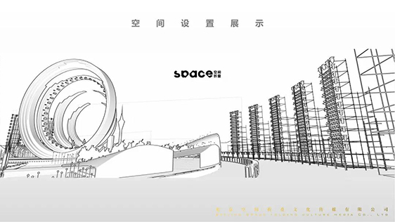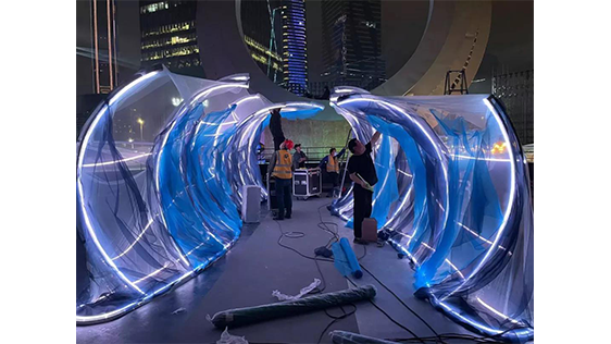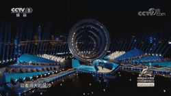 舞臺(tái)中心主體構(gòu)筑分為四組,層層展開(kāi),用簡(jiǎn)潔抽象化的海浪形式營(yíng)造表演的氛圍空間。4組直徑不等的圓環(huán)尺寸分別為直徑20m、直徑17m、直徑15m、直徑12m,主體造型上采用全鋼結(jié)構(gòu)形式搭建而成。圓環(huán)上吊掛燈光、水簾、冷焰火等設(shè)備,總體重量約100噸。