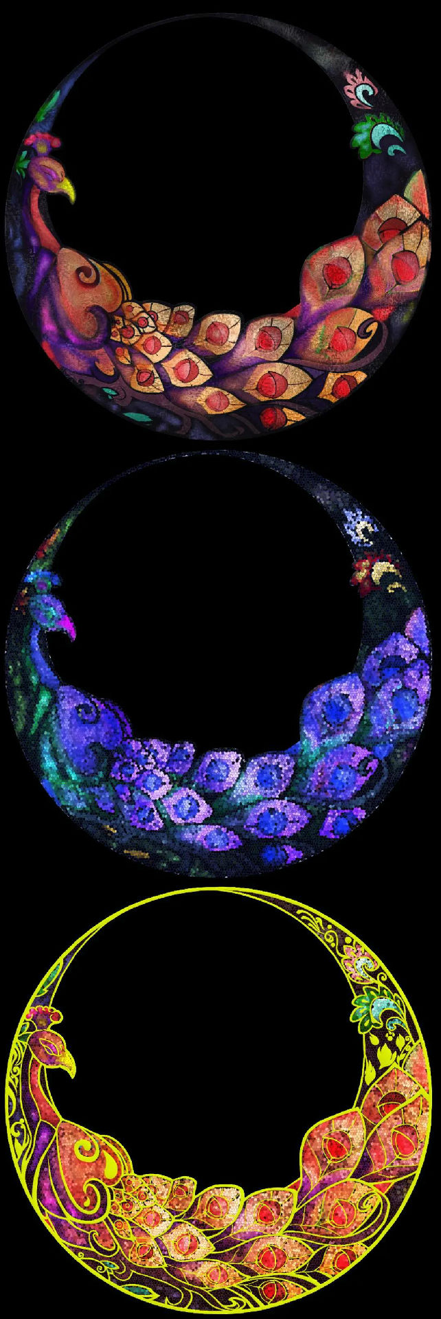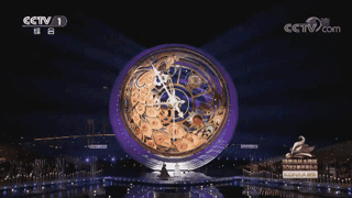 表盤設(shè)計(jì)的過(guò)程,經(jīng)歷了從人物到植物再到紋樣的過(guò)程,最后選定的是高雅美麗的孔雀形象??兹副肀P的材質(zhì)設(shè)計(jì),和形象設(shè)計(jì)一樣,也經(jīng)歷了多輪推敲的創(chuàng)作過(guò)程,從顏色漸變到毛玻璃,最后選用了鑲嵌金絲寶石材質(zhì)。地面的裸眼3D中心舞臺(tái)視覺(jué)則打造了與孔雀相配合的抽象孔雀翎效果。