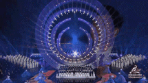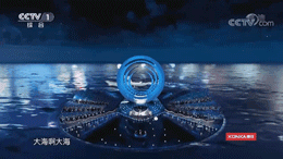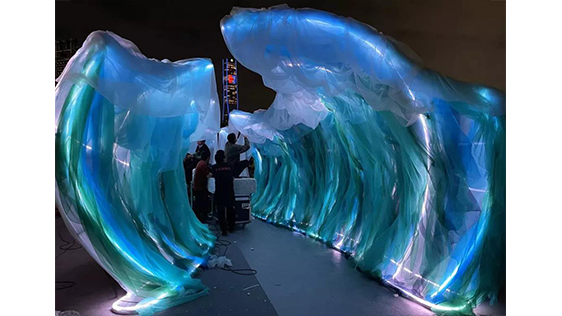 通道置于主舞臺(tái)中間,使用顏色主體為藍(lán)色、綠色、白色的網(wǎng)紗來(lái)構(gòu)成了海洋和浪花。加上光源投射,營(yíng) 造出太陽(yáng)從海浪的縫隙中露面,溫暖的陽(yáng)光以筆直的姿態(tài)刺穿海浪中間,使人們對(duì)未來(lái)與夢(mèng)想充滿向往與憧憬。