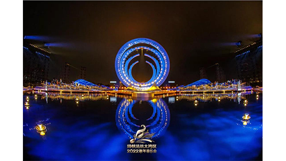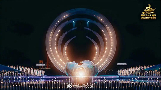 舞臺(tái)主體視覺(jué)以去舞臺(tái)化的概念為出發(fā)點(diǎn),將舞美空間視覺(jué)方向朝城市景觀和裝置融合設(shè)計(jì),滿足晚會(huì)功能性同時(shí),也可作為城市景觀的一部分存在,賦予舞美多重的功能性。在光影渲染下,2022新年音樂(lè)會(huì)在新年第一天,深刻詮釋出大灣區(qū)“勇立潮頭敢為先,奮楫揚(yáng)帆謀新篇”的恢宏氣勢(shì)。