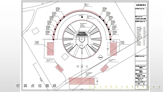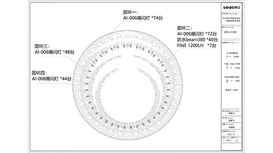 主舞臺(tái)的燈光布局在舞美結(jié)構(gòu)造型的基礎(chǔ)上,采用珠"圓”的環(huán)形設(shè)置表達(dá)美滿、地區(qū)融合的合家歡概念。以簡(jiǎn)潔、去舞臺(tái)化的構(gòu)思進(jìn)行燈位的布局,對(duì)舞美主體采用了外投燈具染色、外頭激光勾勒以及內(nèi)置燈具等燈光處理手段,用燈光去呈現(xiàn)大氣、干凈的視覺(jué)感受。