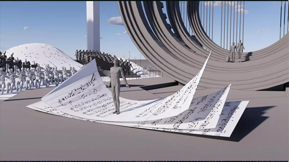 在依海而建的大灣區(qū),筑起融合粵港澳三地地域文化的舞臺(tái),共同譜寫彭拜激蕩的華夏之章。樂(lè)譜置景以“大海啊,故鄉(xiāng)”優(yōu)美動(dòng)聽(tīng)的旋律為主進(jìn)行設(shè)計(jì),畫面 直觀地讓人感受到音樂(lè)帶來(lái)的藝術(shù)之美,一章章樂(lè)譜疊放在一起, 海風(fēng)吹過(guò),一頁(yè)頁(yè)翻起,像海邊的浪花一樣,隨著感情真摯的歌聲擊拍著海內(nèi)外華夏子孫的心房。