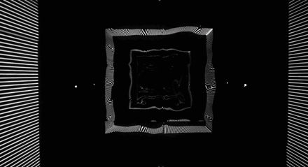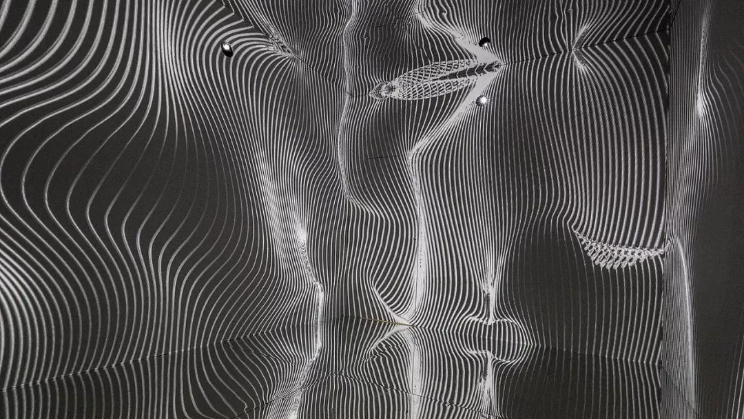 黑白基調(diào)的11分鐘投影包括螺旋線條、黑洞、枯山水似的動態(tài)圖像,仿佛一個鏡面版的時空隧道。