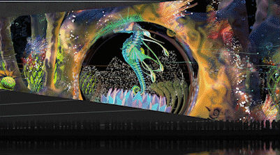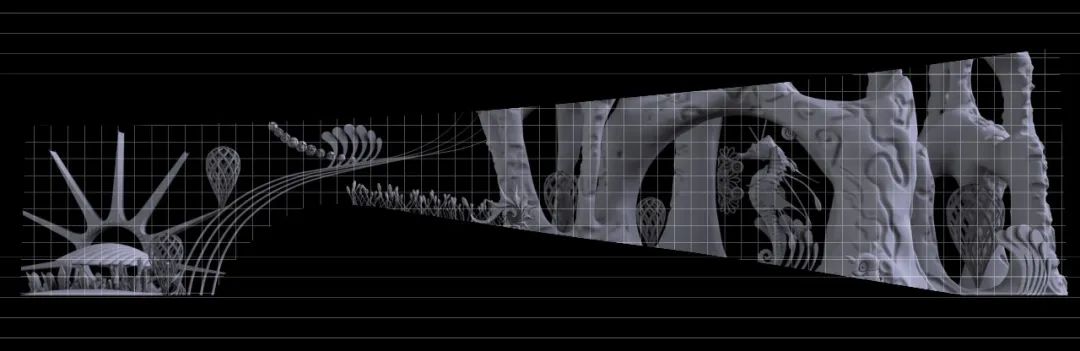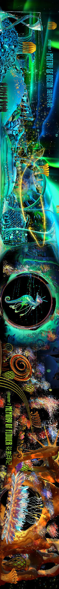 從海洋到陸地、從珊瑚到蒲公英、從三葉蟲到人類,呈現(xiàn)框架置于地球觀之上,在虛擬的藝術(shù)空間內(nèi),讓觀者感受到生命的存在。在作品的最高潮,去探索那些未曾感知到過的領(lǐng)域,體驗(yàn)?zāi)切┟篮脜s又神秘的自然力量,書寫夢(mèng)境中的“光之城”。