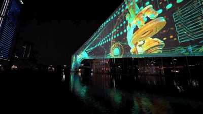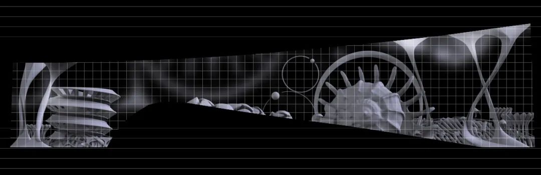 幻鯊文化SKG+用抽象藝術(shù)的風(fēng)格來描繪一切現(xiàn)實(shí)世界中的自然物質(zhì)和人造文明,從而展開一場關(guān)于人類文明和自然世界的對(duì)話。時(shí)空并行,滄海桑田,光影婆娑,在整部作品中,從生命的角度、人類的角度去構(gòu)建一個(gè)宏大的世界觀和曼妙的場景,在光明藝術(shù)中心這座純潔的建筑上,去描繪想象中的多維世界。