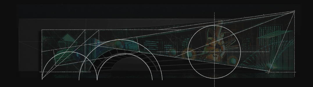 在構(gòu)圖上,這座建筑是非常具有特色的現(xiàn)代化設(shè)計(jì)作品,所以如何把畫面構(gòu)圖巧妙融入建筑本身而不產(chǎn)生割裂和違和感就顯得尤為重要。為了呼應(yīng)“光明之眼”的稱號(hào),我們依據(jù)黃金比例,在建筑的右側(cè)設(shè)計(jì)了一個(gè)圓形作為畫面重心,來串聯(lián)整部作品的每個(gè)章節(jié)。而每個(gè)章節(jié)的二次構(gòu)圖又是完全不同的,同樣的形態(tài)既可以為正形、又可以為負(fù)形、既可以虛化、又可以實(shí)體。所以我們?cè)诜磸?fù)地強(qiáng)調(diào)統(tǒng)一構(gòu)圖的同時(shí),又在不斷地用新的視覺元素來沖破觀眾審美的疲勞感,從而塑造成很強(qiáng)的視覺記憶。