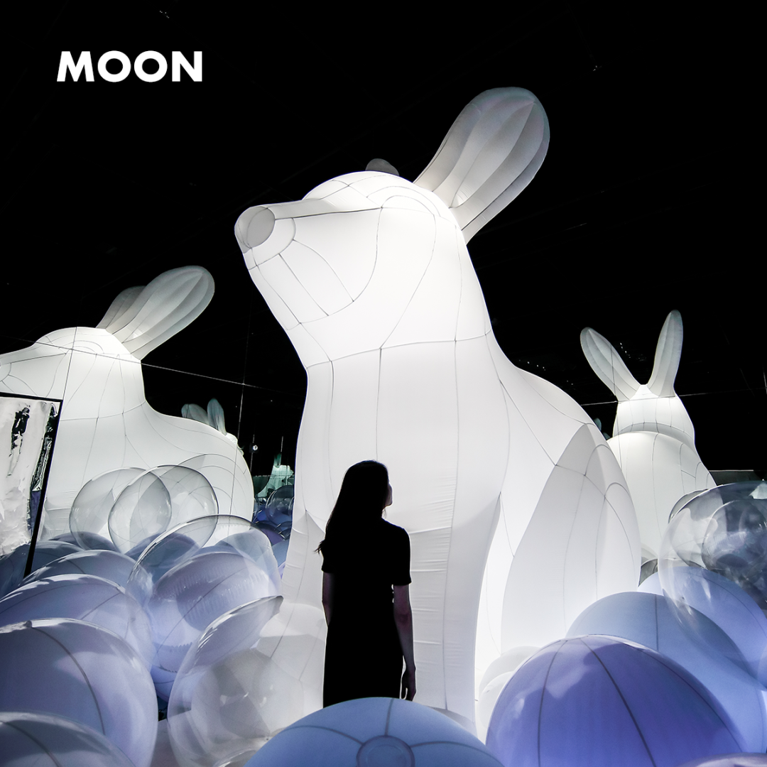 與帶著月光的球中相遇月兔。坐在月球上,等著4米大小的超大型兔子一起玩耍的朋友。在鏡中變得無限的球中,用我的手改變著形形色色的月光,尋找月兔。