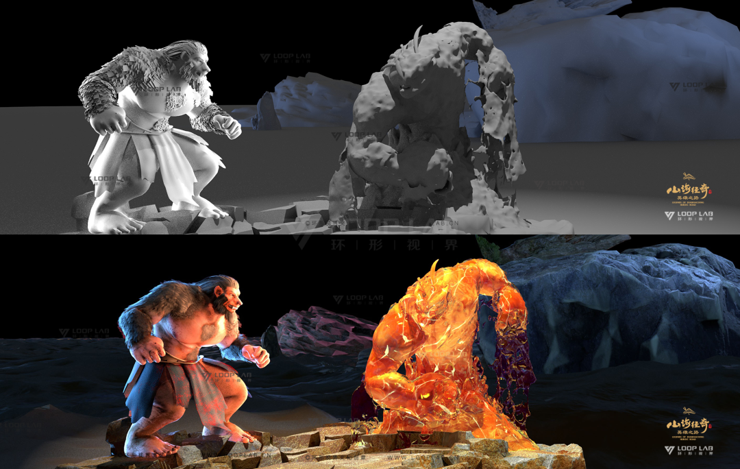 窮奇、夫諸、鸞鳥、玄龜各種神怪異獸,陸離世界在熒光的照射下,顯得栩栩如生;重、黎二神舉天撐地,形成我們所熟知的天地世界……
