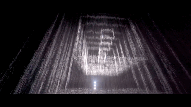 交互是這件作品Periscopista (近月點(diǎn))的一大亮點(diǎn),當(dāng)參與者站在特定的位置前做動(dòng)作,水幕便會(huì)對(duì)應(yīng)出現(xiàn)更加酷炫的效果,除了動(dòng)作還有聲音,當(dāng)參與者對(duì)著裝置上的“喇叭”吶喊,水幕也會(huì)隨著聲音而改變,并且水幕影像中的動(dòng)態(tài)人物的視覺效果中也是有故事的。