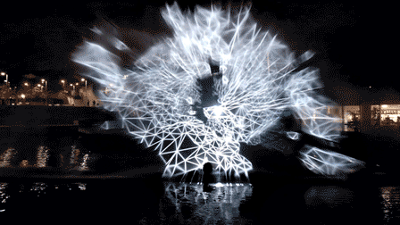 Joanie Lemercier 設(shè)計(jì)的戶外視聽裝置“Constellations”,將三維燈光投射到水中,使它具有波紋的全息效果,結(jié)合電子音樂在空氣中形成不同的形狀和結(jié)構(gòu)。