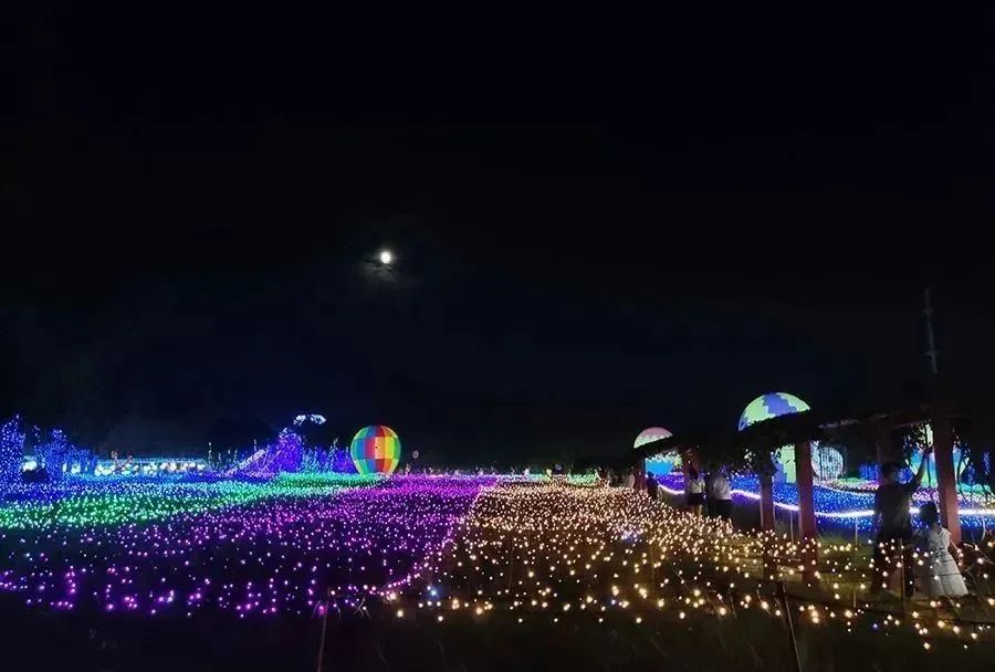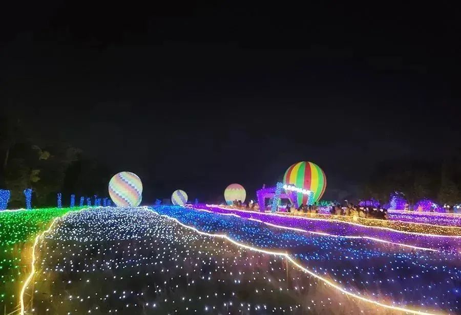 滑道旁邊有一大片燈光花海,下面的“熒光秘境”是非常值得推薦的一個地方。閃爍搖曳的熒光球燈、舒緩的音樂、薄薄的雨霧,猶如夢境一般非常的仙。