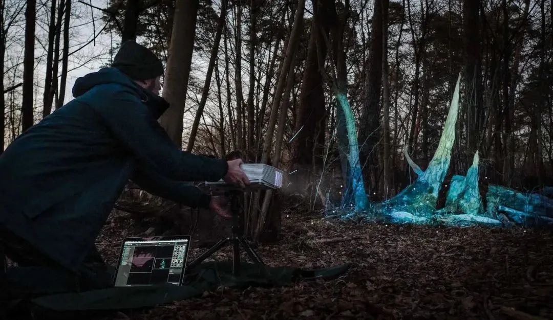 在自然與視覺藝術(shù)中追求平衡美感,強調(diào)與環(huán)境的融合性。其作品投影映射短片《元素》(Elements - A projection mapping short film)將這一創(chuàng)作風(fēng)格展現(xiàn)得淋漓盡致。在投影元素與自然相互融合,構(gòu)建了真實世界和虛擬世界之間的共生關(guān)系,詮釋了人與自然的相處之道。