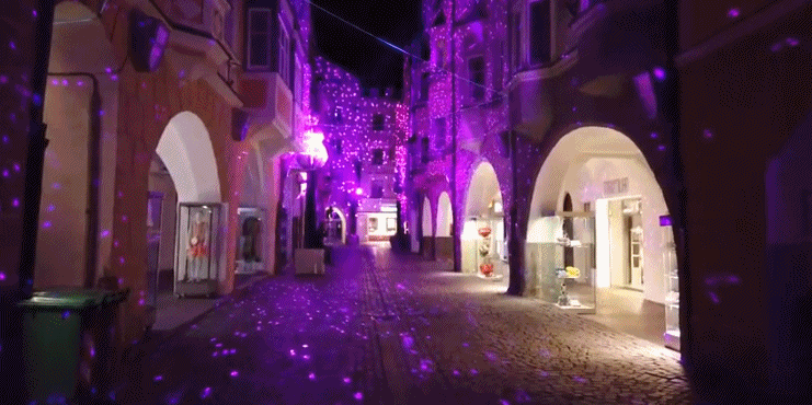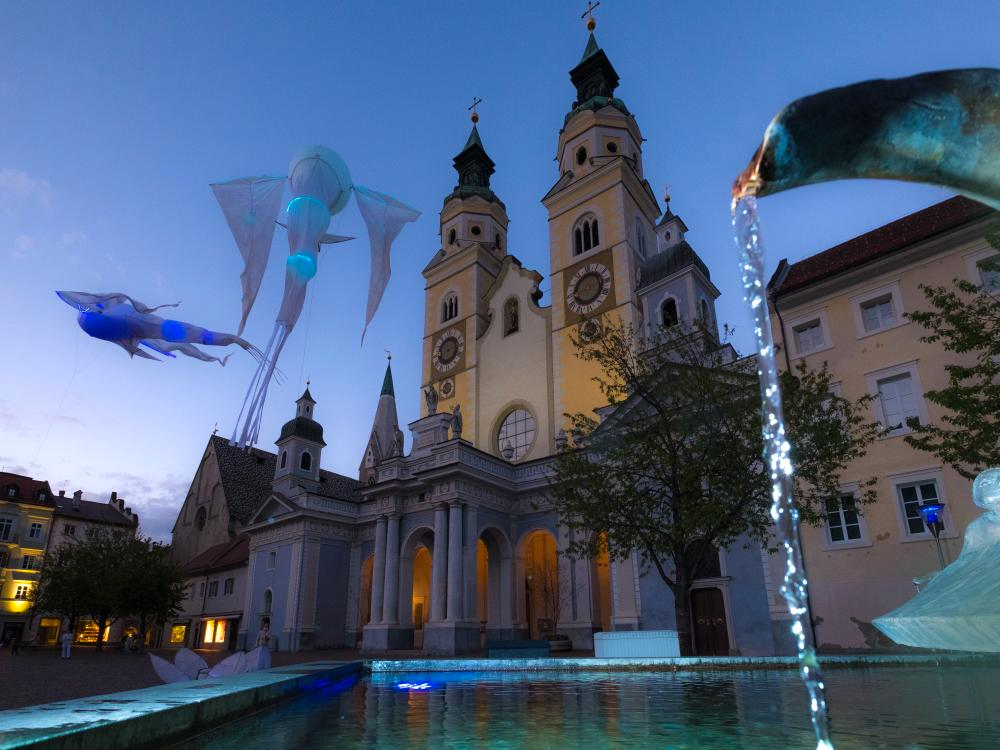 水燈節(jié)用燈光照亮布里克森,兼具奧地利、德國(guó)南部建筑風(fēng)格的小鎮(zhèn)房屋和教堂披上了光影的外衣。藝術(shù)家精心制作的裝置似孔雀開(kāi)屏,如夜間飛行的蝙蝠,像漂浮的海帶。