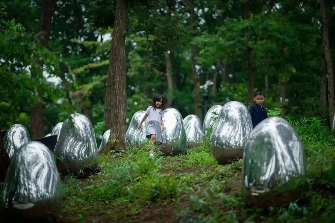 反光的大“橡果”分布在森林叢中。白天,它像調(diào)皮的不倒翁,將周圍的世界映射其中,被推亦或是被風(fēng)吹倒時(shí),會(huì)自己站立起來,同時(shí)發(fā)出多彩的光色與動(dòng)聽聲音。