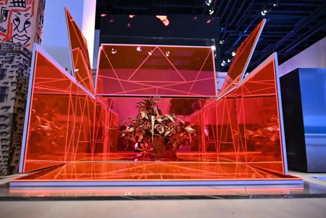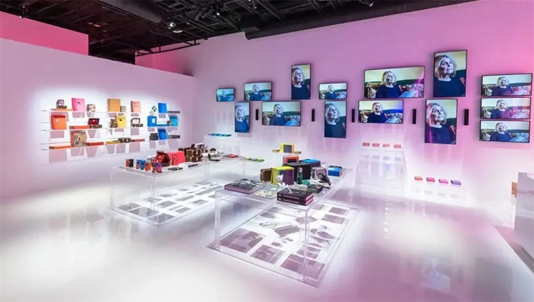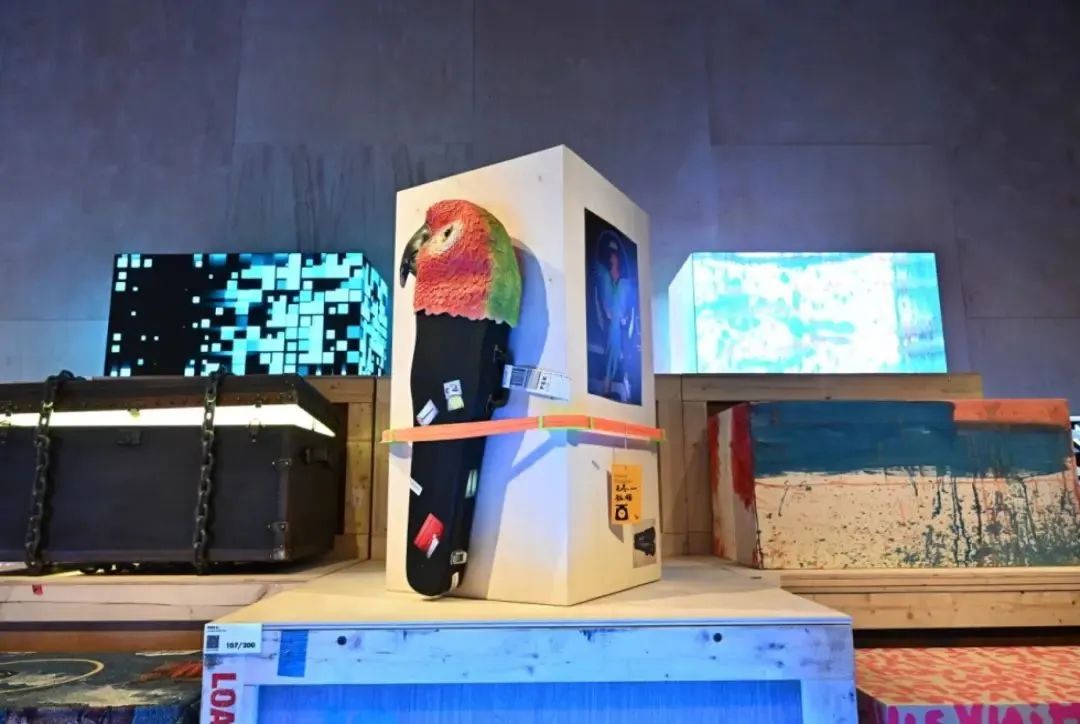 兩個主要空間中的第一個的設(shè)計思路看起來像是來自倉庫的靈感。箱子以一種交錯但隱約帶有雕塑感的排列方式,與帶有屏幕的“魔法箱”并列在一起,每個箱子都堆放在從法國運來時的板條箱上,這些板條箱上還有各種原始的運輸標(biāo)簽。