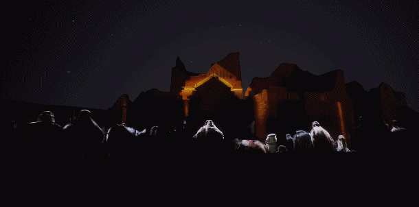 設計團隊以“讓阿圖賴夫廢墟講述自身的歷史故事”為創(chuàng)作概念,以鎖定600平方米的歷史宮殿建筑外墻為“銀幕”,打造7分鐘長的影片。