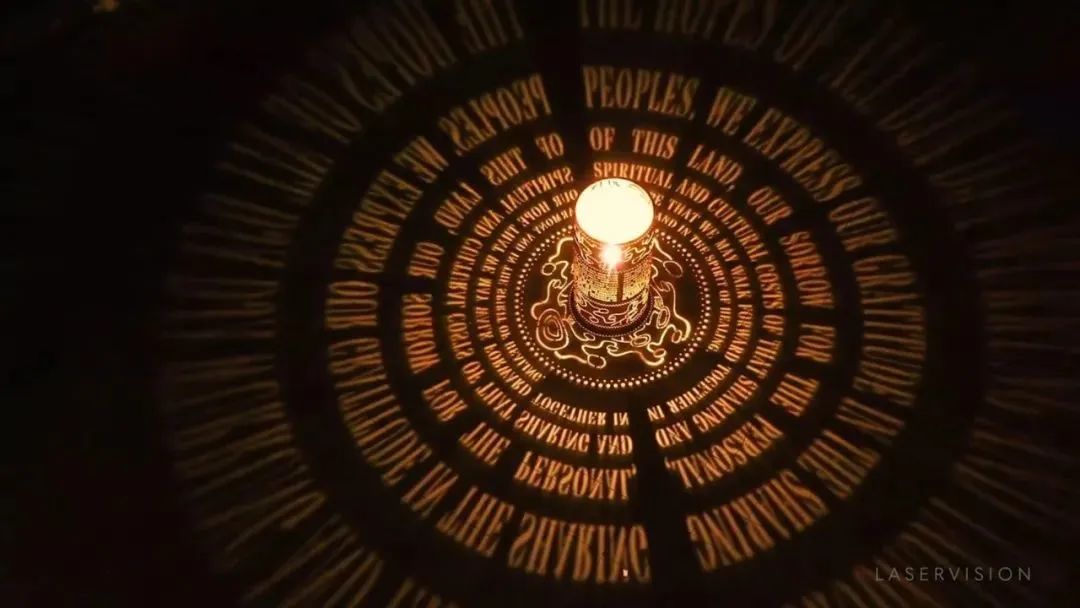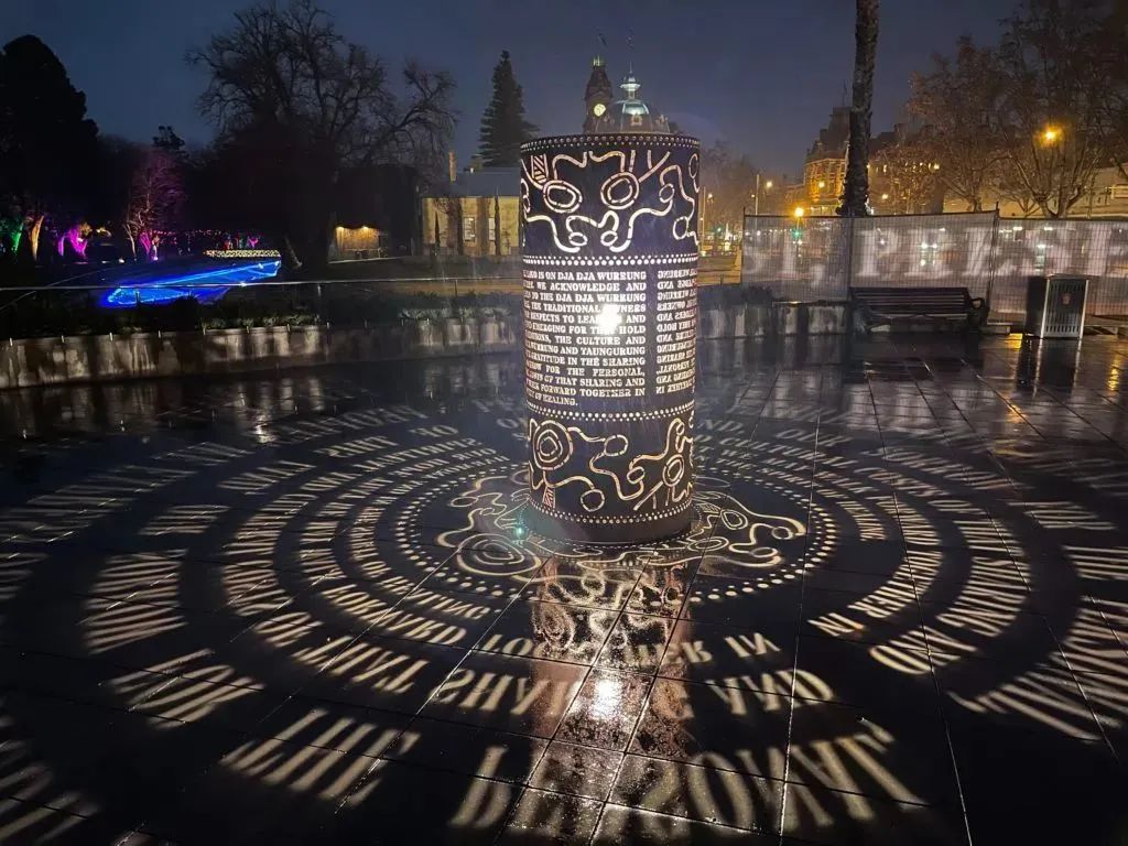 “承認(rèn)國(guó)家”裝置以 Dja Dja Wurrung 標(biāo)志性的燈塔屹立在羅莎琳德公園廣場(chǎng)上,這個(gè)兩米高的燈光雕塑燈火通明,其頂部和底部圍繞著 Dja Dja Wurrung 人們創(chuàng)作出的藝術(shù)作品。