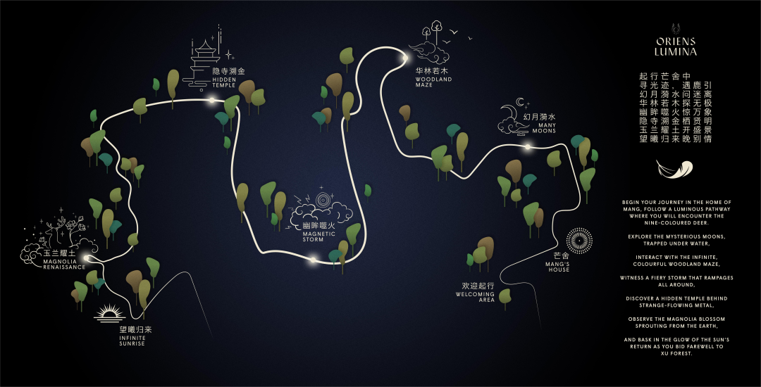 作為奉賢新城文旅項(xiàng)目年度扛鼎之作,LUMINA夜游項(xiàng)目總占地面積超8萬平方米、游覽路線總長約1.5公里。以中央公園現(xiàn)狀為基礎(chǔ),以傳統(tǒng)文化《山海經(jīng)》和陰陽五行學(xué)說為創(chuàng)作靈感,構(gòu)建出一個(gè)全世界面積最大、內(nèi)容最為豐富的Lumina夜游。整個(gè)森林之旅需要45分鐘到1小時(shí)。