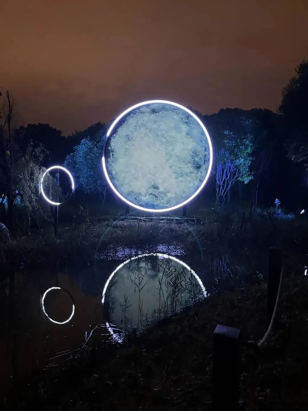項(xiàng)目包含“幻月漪水”“華林若木”“幽眸噬火”“隱寺溯金”“玉蘭耀土”五大主題場景,分別象征“水、木、火、金、土”五大原生能量元素,同時(shí)融入了玉蘭花、滾燈、“賢文化”等本土文化元素,將夜幕籠罩下的森林公園化身為“旭林秘境”,讓游客在太陽守護(hù)使者“芒”的引領(lǐng)之下,開啟一場驚心動魄的尋光奇旅。