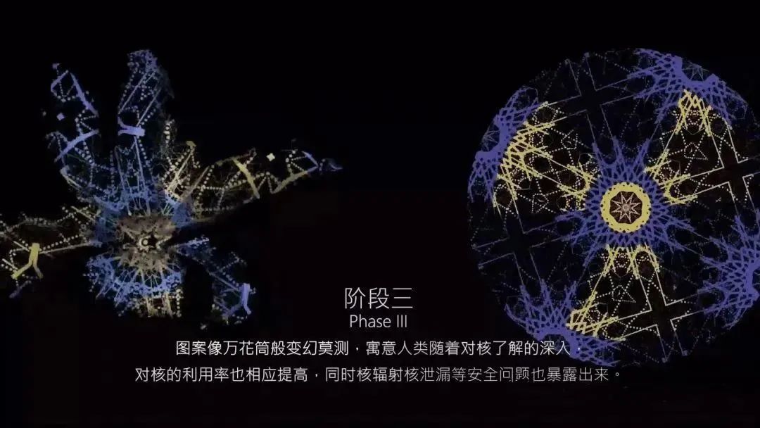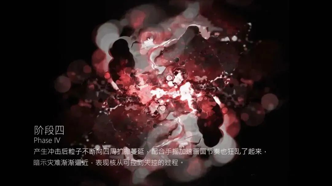 裝置整體分為投影和手搖控制兩部分。觀眾通過搖動握手裝置將速度控制在一定值,核花則以極速綻放;當(dāng)速度超過一定范圍時(shí),核花會爆炸。通過裝置“核花”,創(chuàng)作者希望告訴我們:核能是福是禍——這完全取決于人類如何使用核能,而不是核本身。