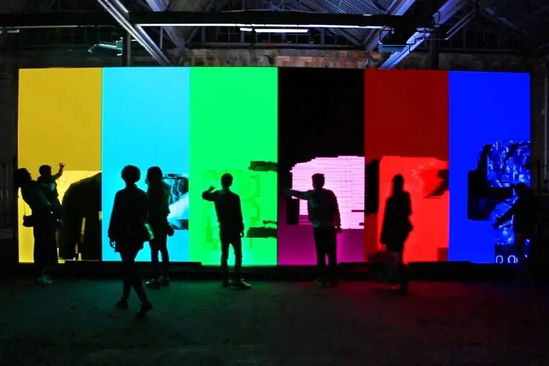 這件作品展示在一面巨大的 LED 墻上,采用幾個(gè)垂直彩條的形式,類似于電視信號(hào)斷開時(shí)會(huì)出現(xiàn)的情況。當(dāng)參與者觸摸 LED 屏幕時(shí),系統(tǒng)會(huì)調(diào)諧到實(shí)時(shí)電視信號(hào)并播放隨機(jī)片段,這些片段會(huì)隨著觀眾的手部動(dòng)作變化而出現(xiàn)失真。