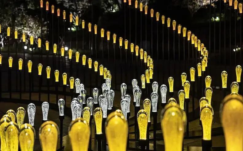 作品「透明苑」主體由300多顆手工吹制的雙層水滴玻璃組成,并將玻璃燈柱以對(duì)稱方式陣列排序,形塑出一種象征信仰的意象。