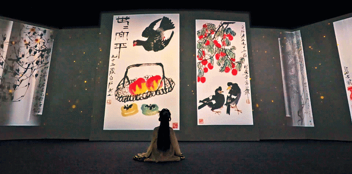 運用數(shù)字化技術(shù)合成并重構(gòu)白石老人的藝術(shù)世界,通過藝術(shù)情景的融合,讓觀眾沉浸在特定空間內(nèi),將齊白石筆下之物一一活化。借助數(shù)字藝術(shù)的特點,我們得以跨越時間的維度,與齊白石燦爛的文化遺產(chǎn)重啟對話。這一場傳統(tǒng)文化與數(shù)字藝術(shù)的相遇,連接傳統(tǒng)與時代,讓文化跨越時空,重新煥發(fā)現(xiàn)代活力。