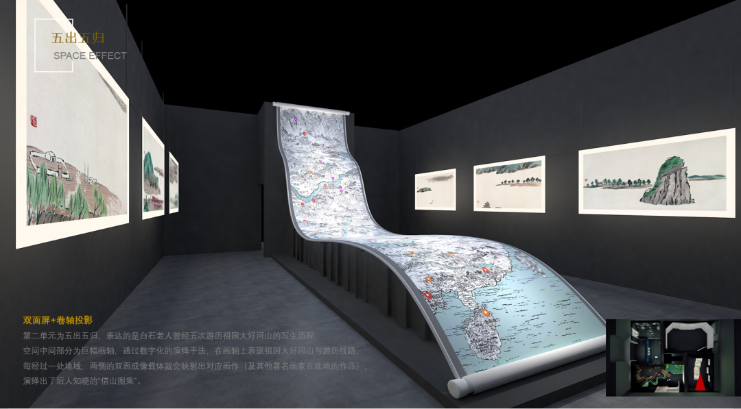將白石老人作品與真實山川結(jié)合,呈現(xiàn)齊白石行旅軌跡。空間中間部分打造為巨幅畫軸,通過雙面屏和卷軸投影的數(shù)字化演繹手法,在畫軸上表現(xiàn)祖國大好河山與游歷線路,每經(jīng)過一處地域,兩側(cè)的雙面成像載體就會映射出對應畫作(及齊白石臨摹著名畫家在此地的作品),演繹出了后人知曉的《借山圖冊》。你將立于“五出五歸”的巨大畫卷前,看齊白石遠游的路,入目的景,鑒賞過的古人書畫,感受師前人與師造化所帶來的視覺洗禮。