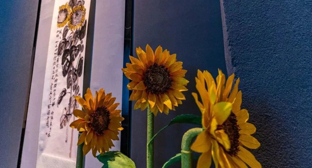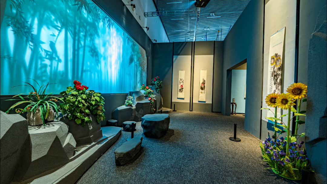 第三個單元名為“一花一世界”,是整個展覽的核心展區(qū),創(chuàng)作團隊在空間構(gòu)成中運用折角造型,寓意齊白石一生的曲折與堅強。在這里觀眾們可以沉浸在白石老人的花鳥作品之中,真切的體會一代大師對生活的細微觀察及繪畫背后的人生見解,與大師產(chǎn)生共鳴與欽佩之情。