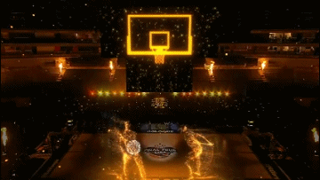 粒子運(yùn)動軌跡組成兩名身材高大的球員,他們以帥氣的投籃動作霸屏球場。讓觀眾迫不及待想要看到球員們在賽場上奔跑、投籃的樣子。